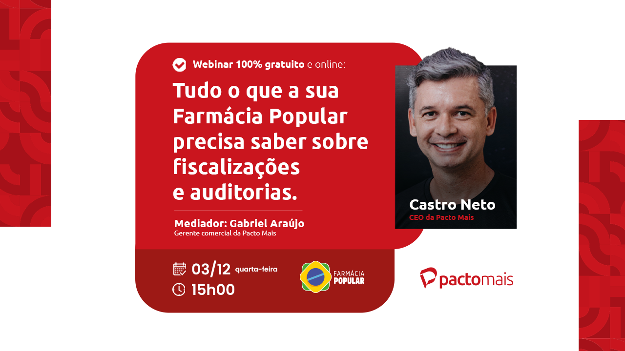 Em um cenário de crescimento das auditorias e fiscalizações cada vez mais rigorosas, a sua Farmácia Popular está preparada para entrar em 2026 com segurança? Junte a sua equipe e participe de um encontro essencial para todas as farmácias que buscam estar seguras em relação a Portaria do PFPB.